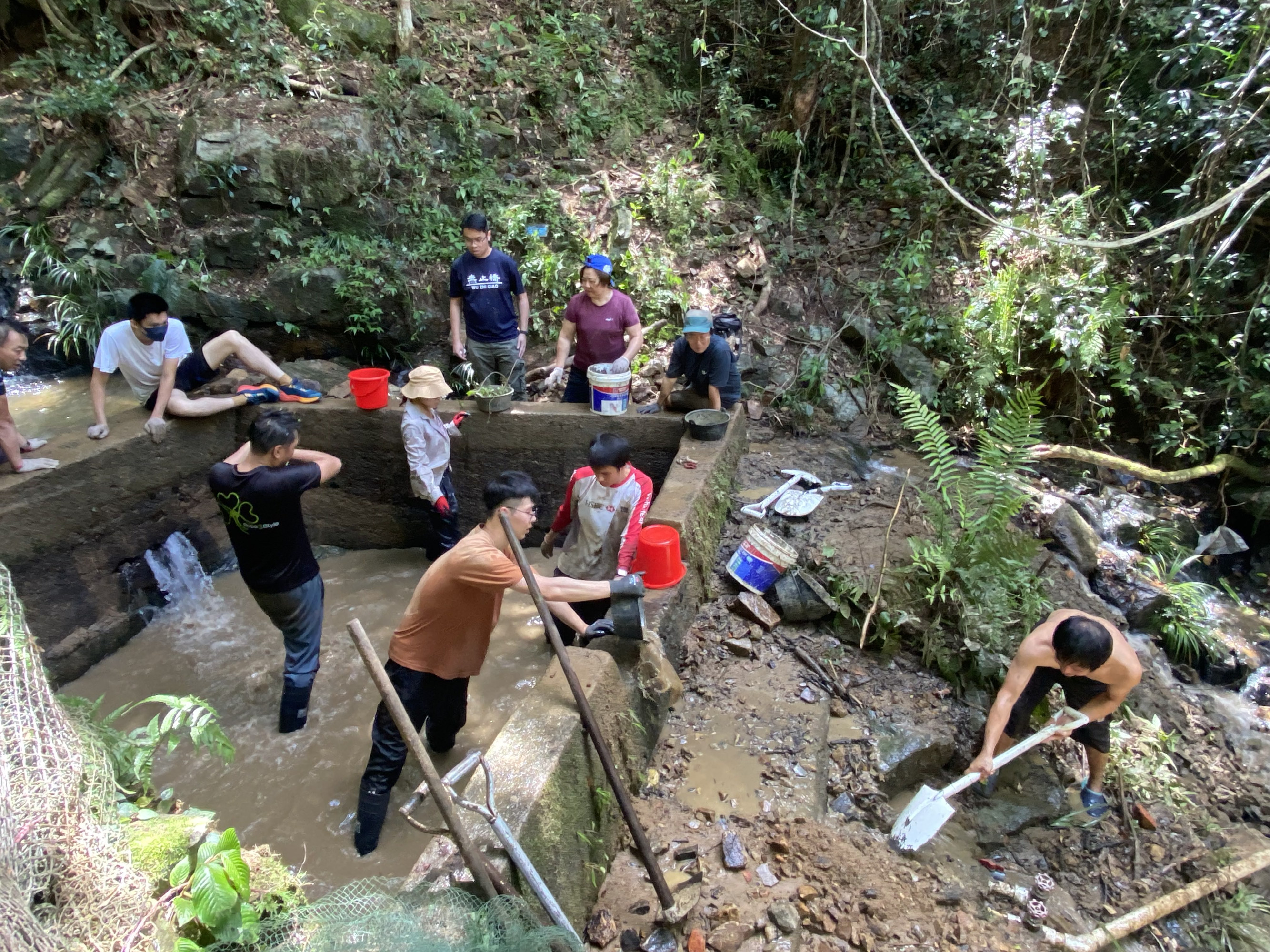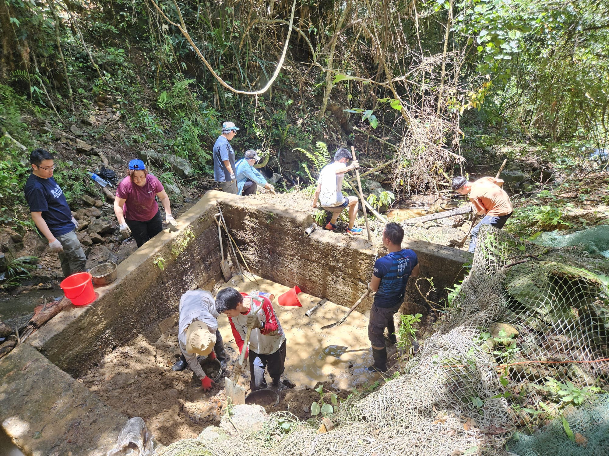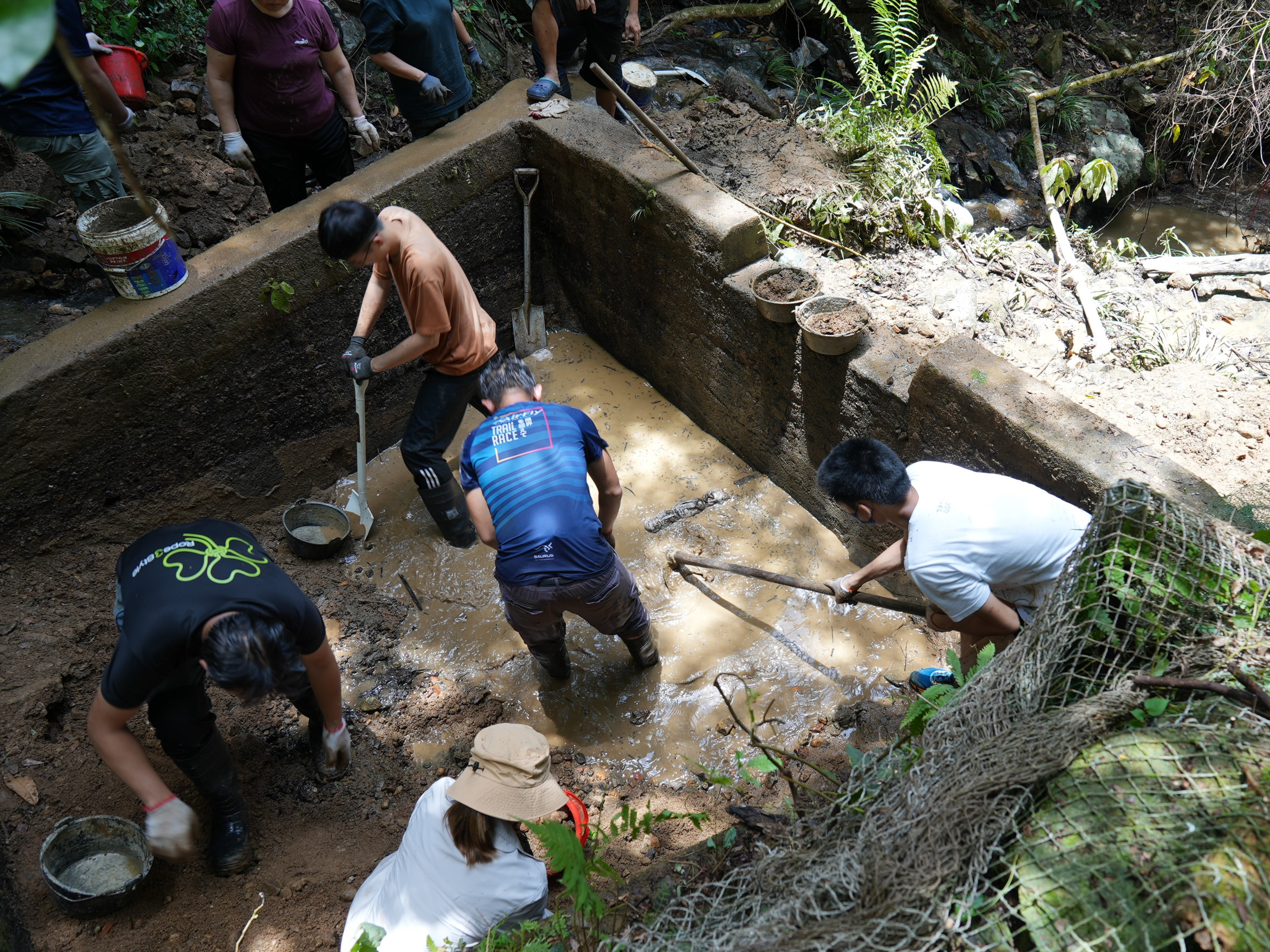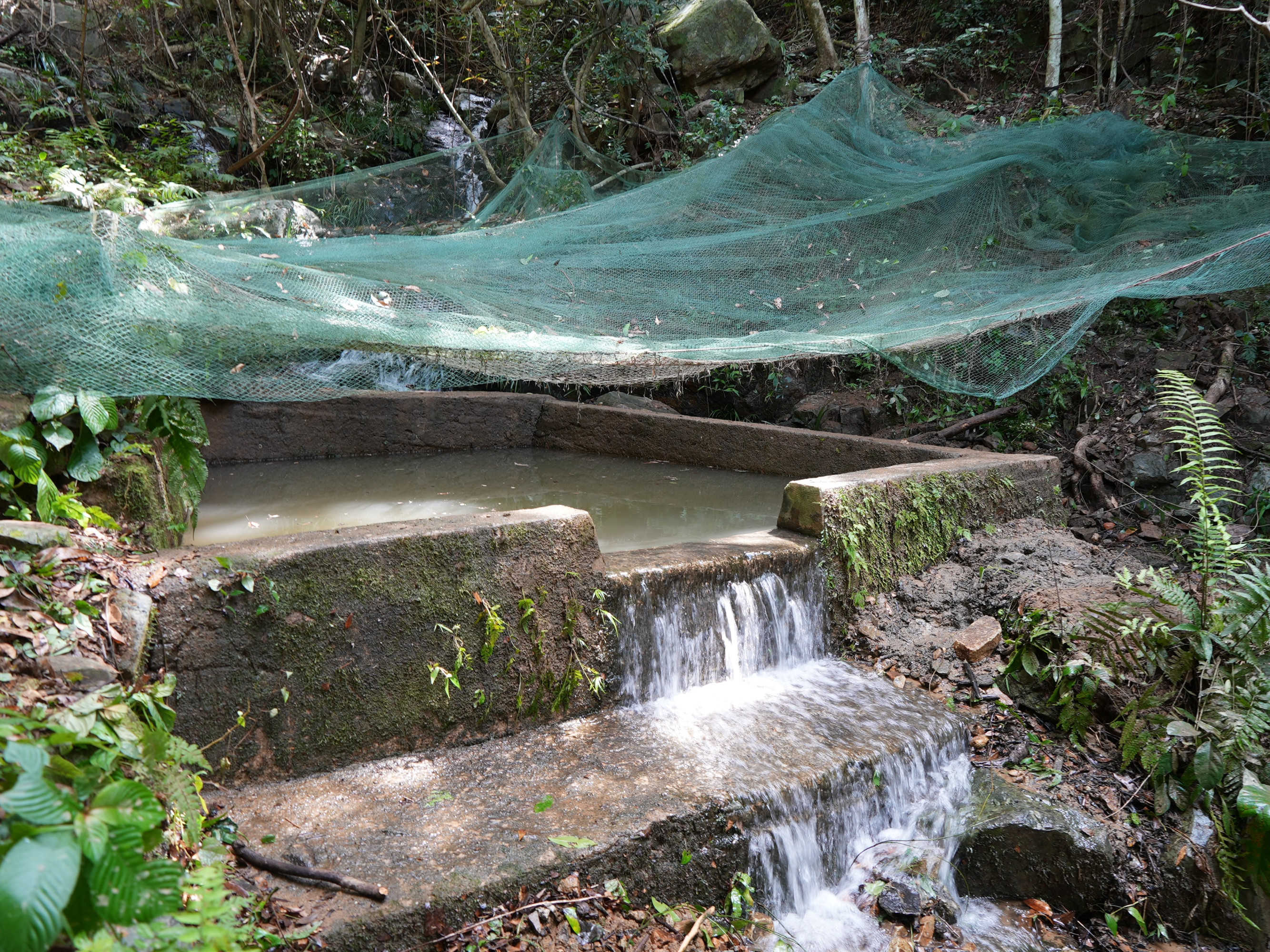为确保梅子林有充足且洁净的水源,村民每年会定期合力清理水塘。趁着雨季前,村长亲自带领村民、一众义工及项目团队成员清理水塘。沿老屋旁的山路拾级而上,步行约十分钟,便可看到一大片绿色的尼龙网。网下为两个相连的小蓄水池,双层尼龙网用以阻隔落叶。石坝高至胸口,中间的出水位前放置了一块的烧烤网。这简单而巧妙的系统,是由村民自行设计并经多年改良,为梅子林村供水数十载。