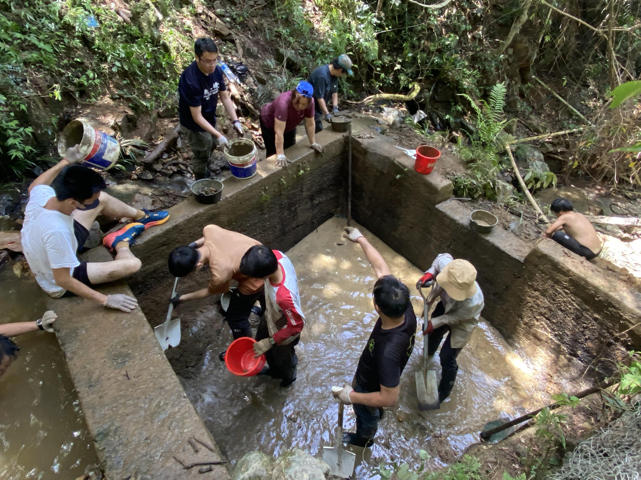 清理工作开始时,众人先解开树上的绳索,合力掀开大网,开始放水。放水后,部分人负责在蓄水池内挖除淤泥,部分则协助将泥沙一桶桶运走,最后疏通水管。虽然过程艰辛,汗流浃背,偶有怨言,但在阵阵笑声与喧闹声中,清理工作顺利完成。