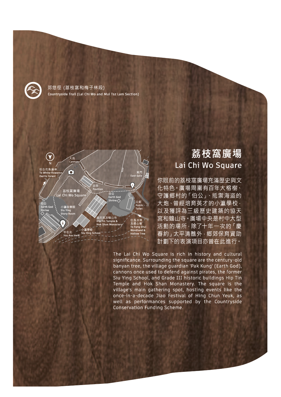 荔枝窩廣場充滿歷史與文化特色。廣場周圍有百年大榕樹、守護鄉村的「伯公」、抵禦海盜的大炮、曾經培育英才的小瀛學校,以及獲評為三級歷史建築的協天宮和鶴山寺。廣場中央是村中大型活動的場所,除了十年一次的「慶春約」太平清醮外,鄉郊保育資助計劃下的表演項目亦曾在此進行。