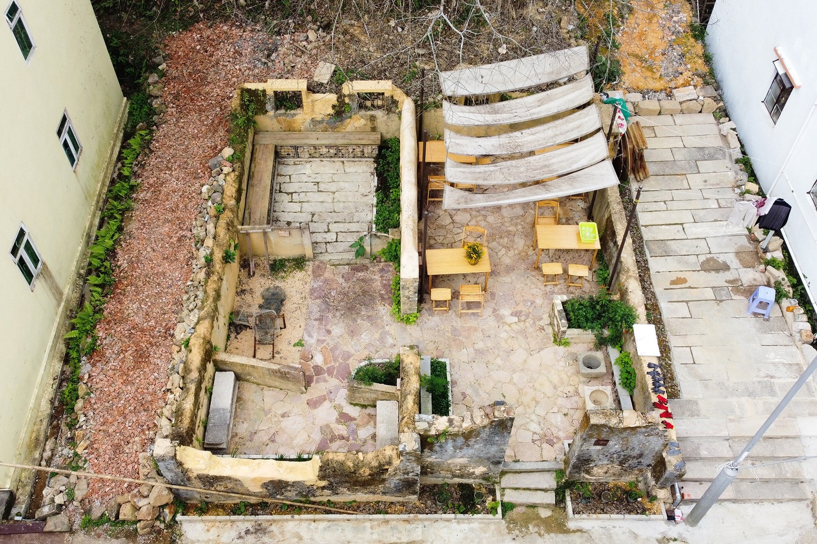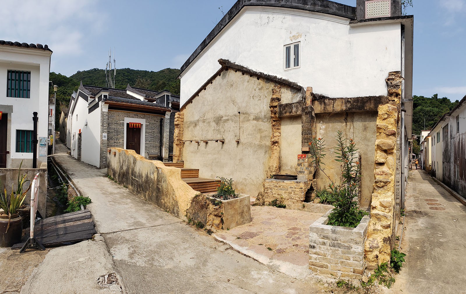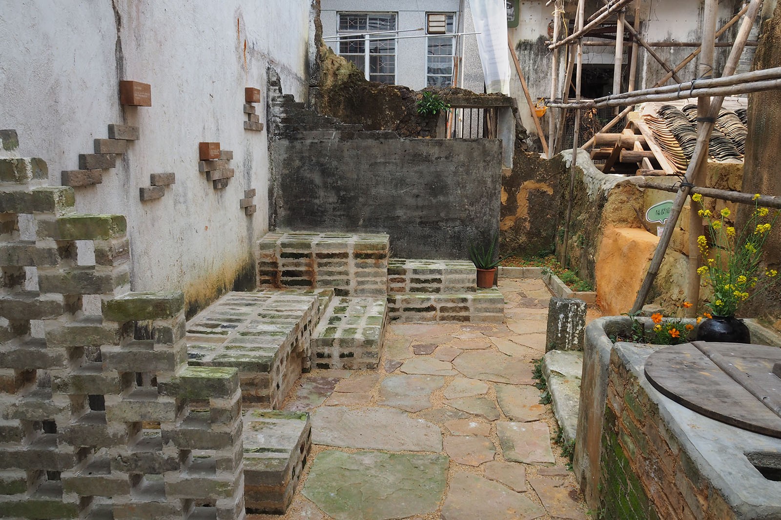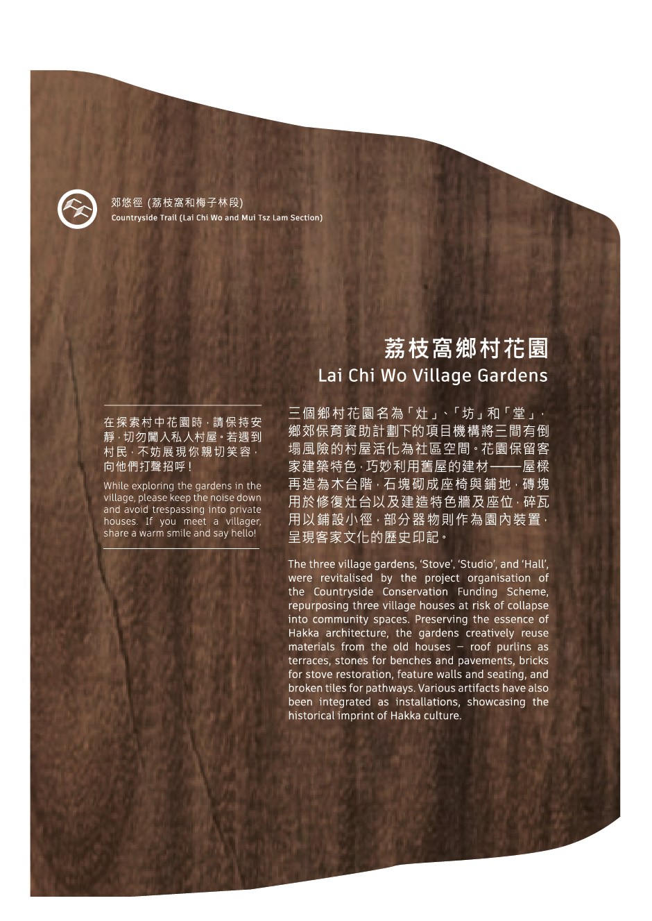 三個鄉村花園名為「灶」、「坊」和「堂」,鄉郊保育資助計劃下的項目機構將三間有倒塌風險的村屋活化為社區空間。花園保留客家建築特色,巧妙利用舊屋的建材───屋樑再造為木台階,石塊砌成座椅與鋪地,磚塊用於修復灶台以及建造特色牆及座位,碎瓦用以鋪設小徑,部分器物則作為園內裝置,呈現客家文化的歷史印記。