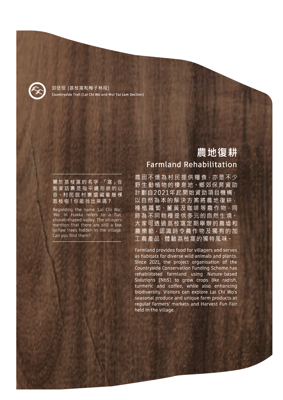 農田不僅為村民提供糧食,亦是不少野生動植物的棲息地。鄉郊保育資助計劃自2021年起開始資助項目機構,以自然為本的解決方案將農地復耕,種植蘿蔔、薑黃及咖啡等農作物,同時為不同物種提供多元的自然生境。大家可透過荔枝窩定期舉辦的農墟和農樂節,認識時令農作物及獨有的加工農產品,體驗荔枝窩的獨特風味。