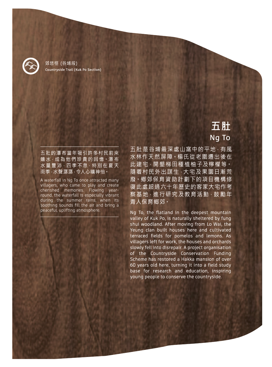 五肚是谷埔最深處山窩中的平地,有風水林作天然屏障。楊氏從老圍遷出後在此建宅,開墾梯田種植柚子及檸檬等。隨着村民外出謀生,大宅及果園日漸荒廢。鄉郊保育資助計劃下的項目機構修復此處超過六十年歷史的客家大宅作考察基地,進行研究及教育活動,鼓勵年青人保育鄉郊。