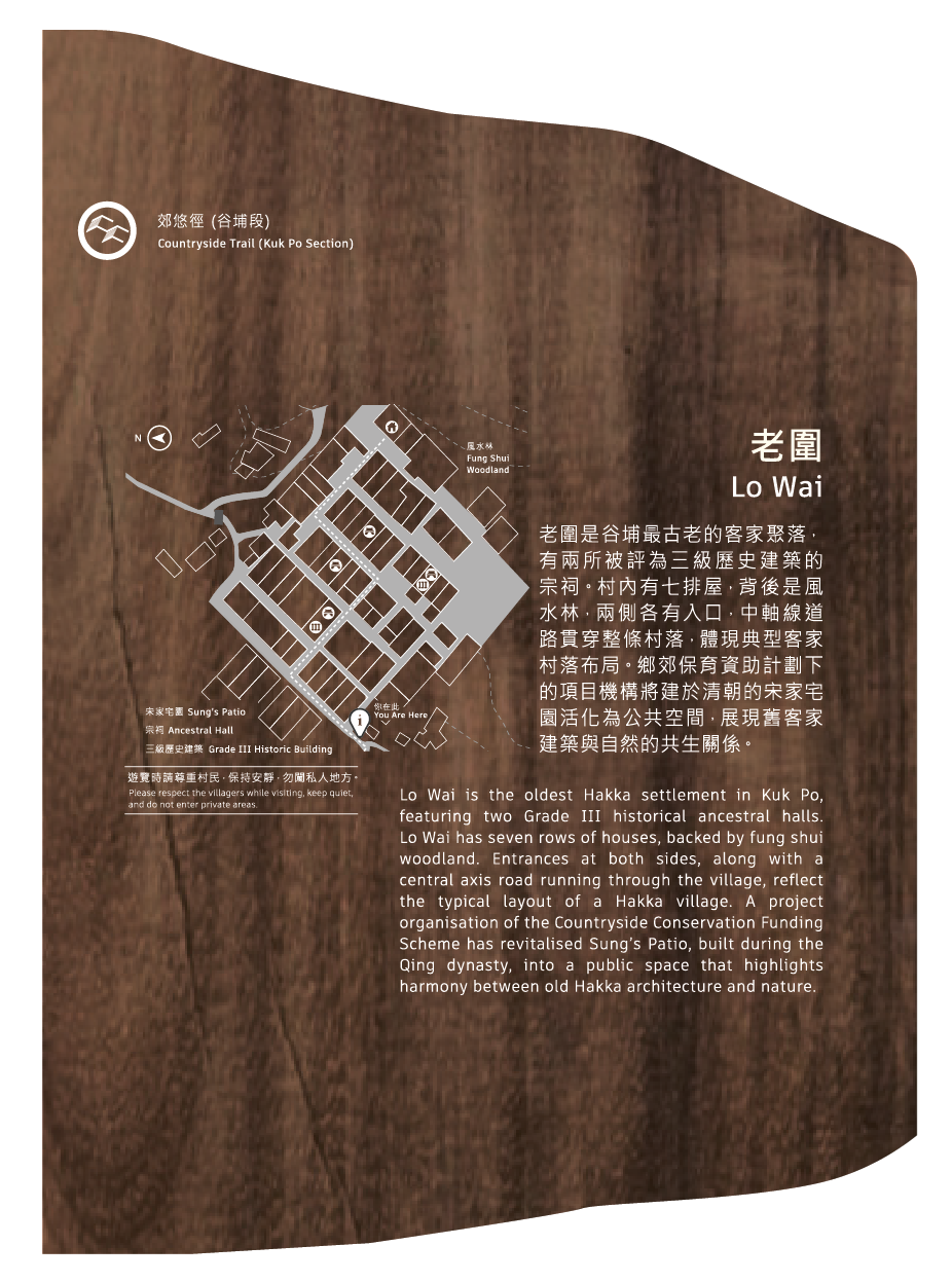 老圍是谷埔最古老的客家聚落,有兩所被評為三級歷史建築的宗祠。村內有七排屋,背後是風水林,兩側各有入口,中軸線道路貫穿整條村落,體現典型客家村落佈局。鄉郊保育資助計劃下的項目機構將建於清朝的宋家宅園活化為公共空間,展現舊客家建築與自然的共生關係。