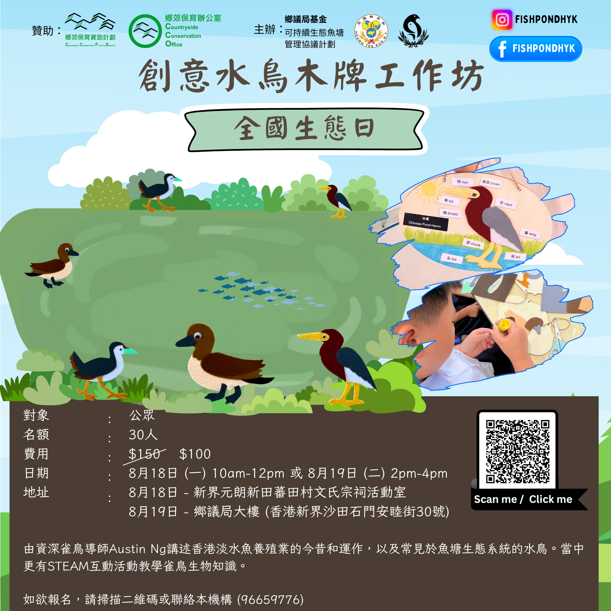 由資深雀鳥導師Austin Ng講述香港淡水魚養殖業的今昔和運作,以及常見於魚塘生態系統的水鳥。當中更有STEAM互動活動教學雀鳥生物知識。